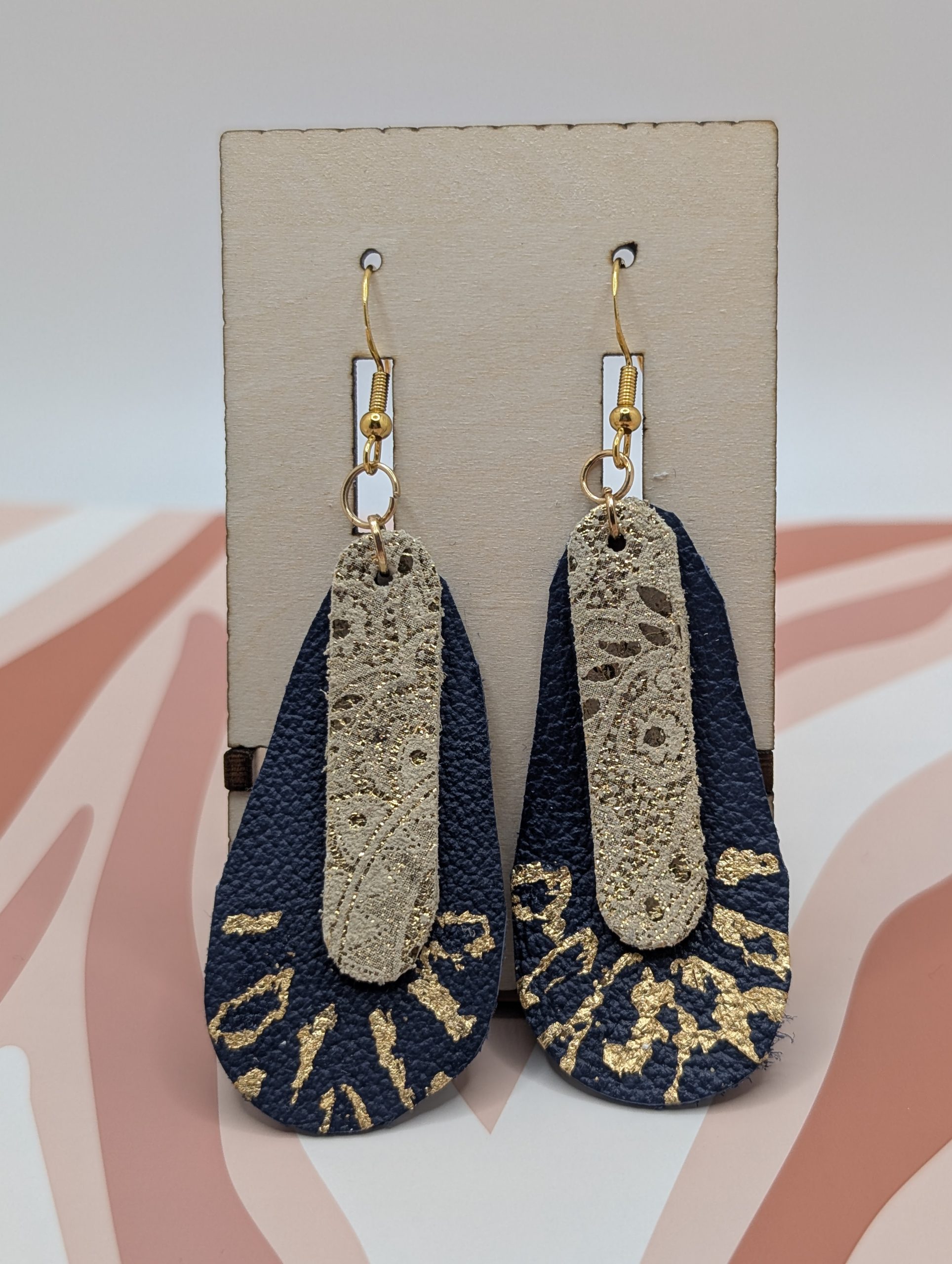 These stunning earrings are crafted from premium navy leather, enhanced with a touch of elegance through golden flakes that create a striking contrast. The leather is meticulously cut using punch cutter tools, allowing for precise, clean shapes that bring out the bold, geometric design. The rich navy hue pairs beautifully with the shimmering gold flakes, which catch the light and add a touch of glamour. The result is a pair of earrings that are both sophisticated and modern, perfect for making a statement at any occasion. Lightweight and comfortable, these earrings are an ideal blend of artistry and style, adding a luxurious yet wearable touch to your accessory collection.